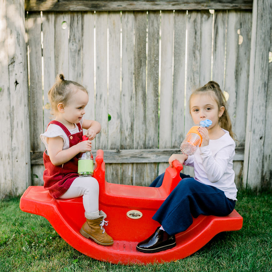 a criança vira a garrafa, aperta, derruba… e pronto — água, suco ou leite espalhados por todo lado.