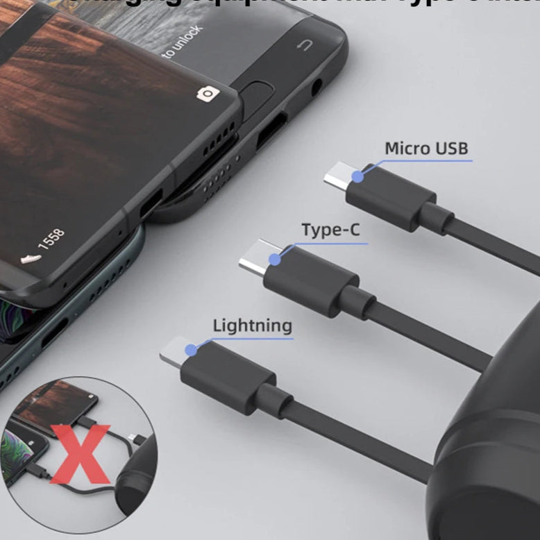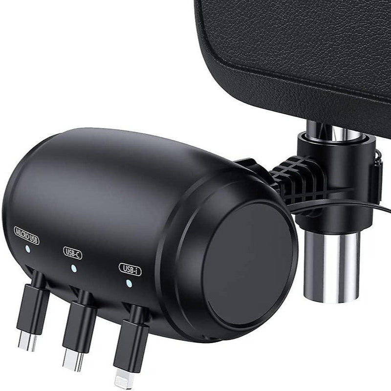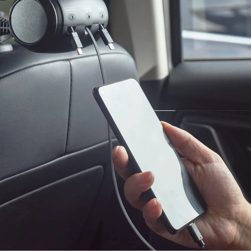 Com o Carrega All 3 em 1, você transforma seu banco traseiro em uma central inteligente de carregamento, com 3 cabos retráteis embutidos, compatíveis com qualquer smartphone, e um visual moderno que evita qualquer bagunça.