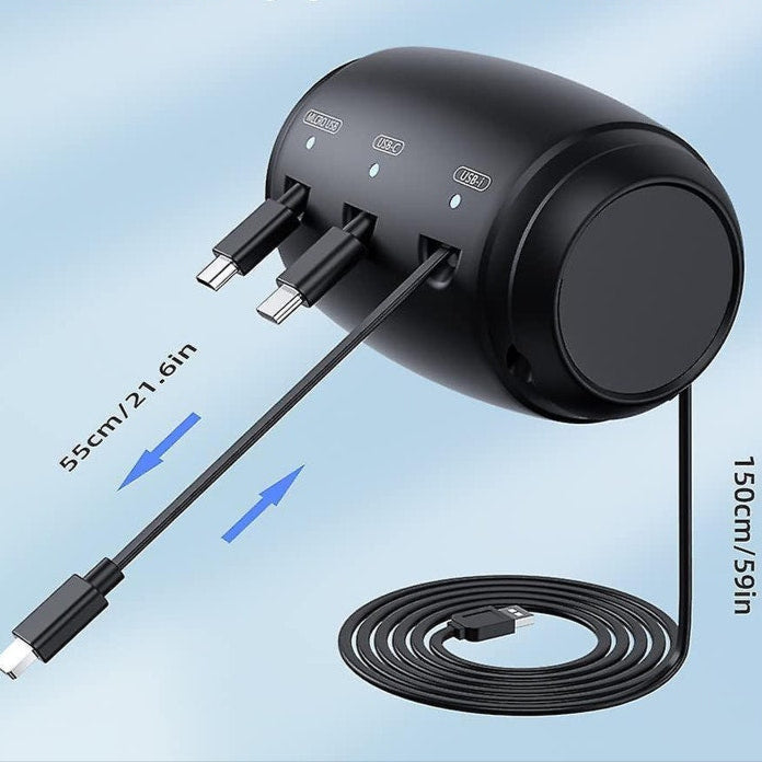 Vem com cabos Micro-USB, USB-C e Lightning (iPhone), permitindo carregamento simultâneo de até 3 aparelhos.